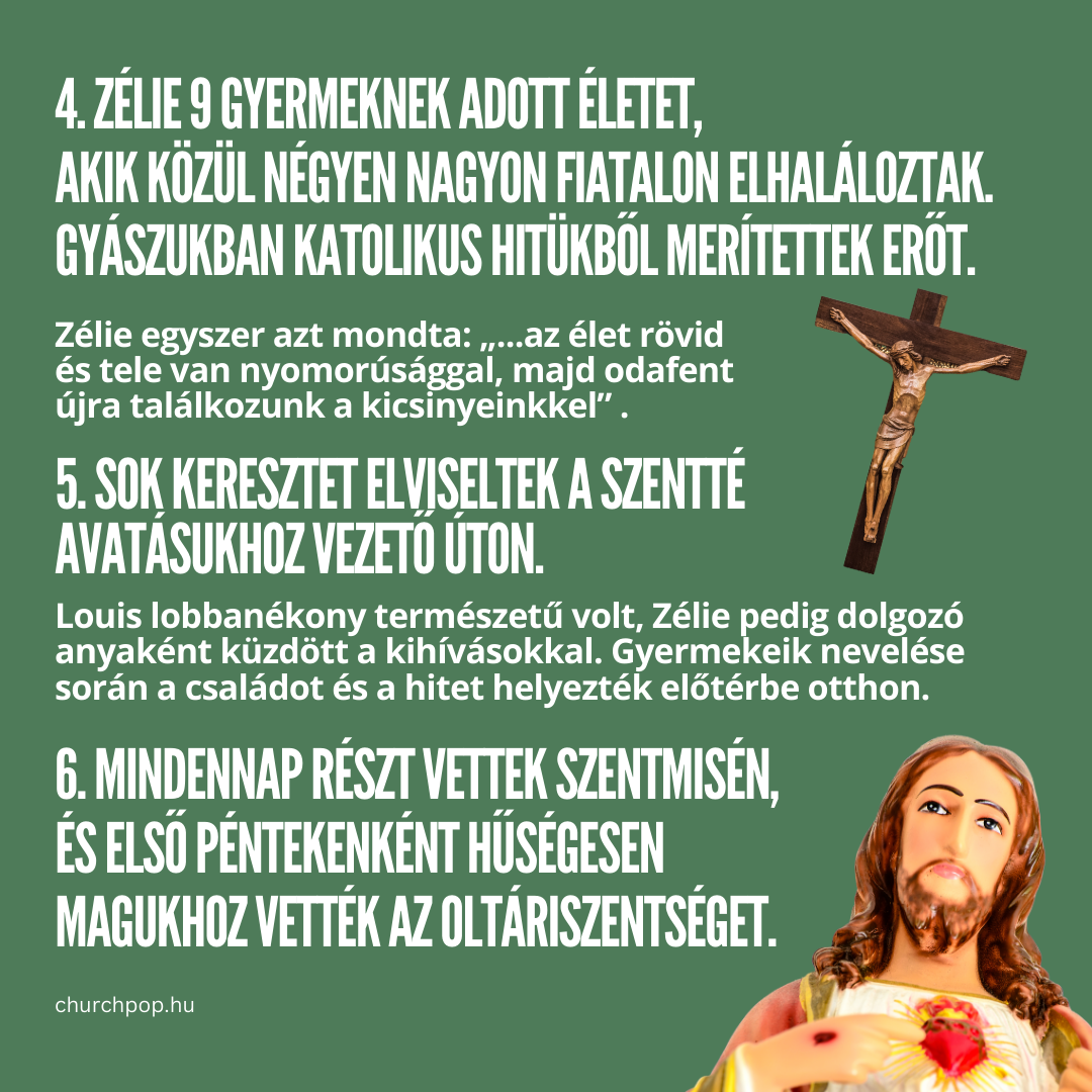 4. Zélie 9 gyermeknek adott életet, akik közül négyen nagyon fiatalon elhaláloztak. Gyászukban katolikus hitükből merítettek erőt.