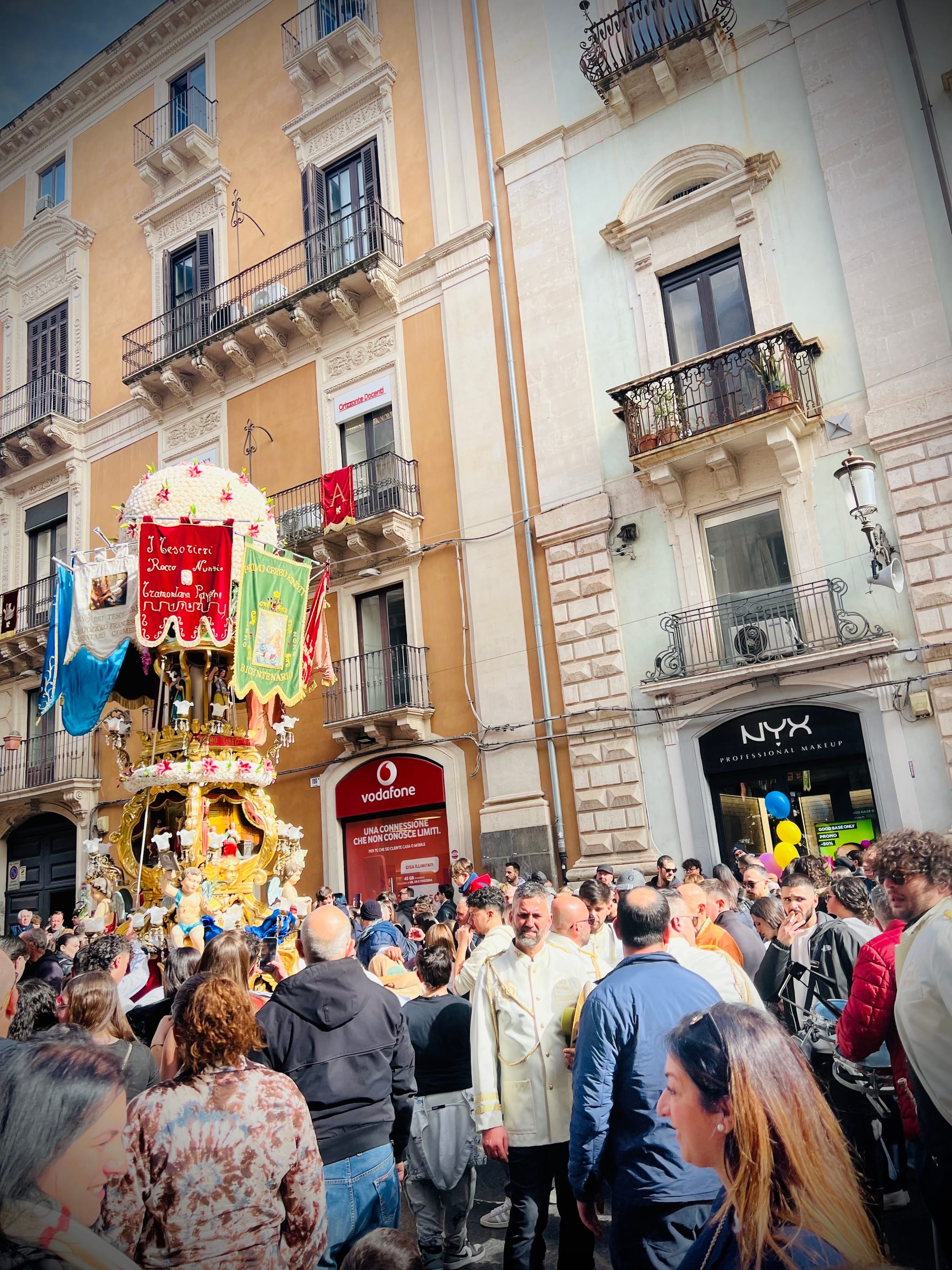 Az útikönyveket olvasva, és az Instát pörgetve láttuk meg később, hogy kiruccanásunk utolsó napján lesz szerencsénk elcsípni ezt az ünnepséget. Reggel nyakunkba vettük a várost, és pár lépéssel a szállásunktól máris hatalmas tömeg fogadott minket. Hatalmas arany „hintók” emelkedtek ki a tömegből, amiknek a megmozdításához hatalmas erő kell. Zenekarok trombitáltak olasz és latin dallamokat, mi is nagyon élveztük ezt a pezsgést.