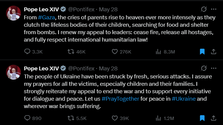 Május 28-án XIV. Leó pápa – ismét – határozottan megszólalt a világ két legsúlyosabb háborús konfliktusával kapcsolatban. A Szentatya X-oldalán megosztott bejegyzéseiben a Gázai övezet és Ukrajna civil lakosságának szenvedésére irányította a figyelmet. Különösen a gyermekek tragikus sorsa érintette meg: miközben az egyik posztban a szülők kétségbeesett kiáltásairól ír, akik halott gyermekeiket ölelve keresnek menedéket, a másikban a friss ukrajnai támadások áldozataiért ajánlja fel imáit, és a háború befejezésére, valamint a békét szolgáló párbeszéd támogatására szólít fel.