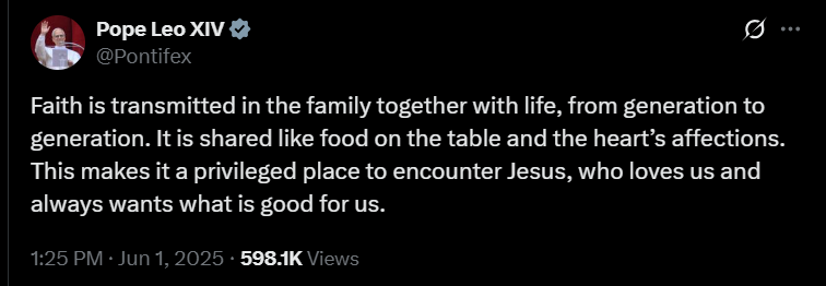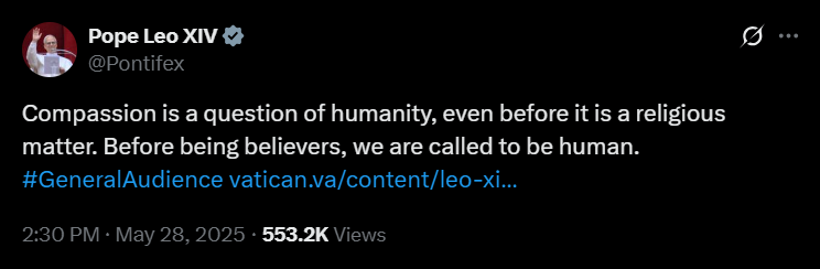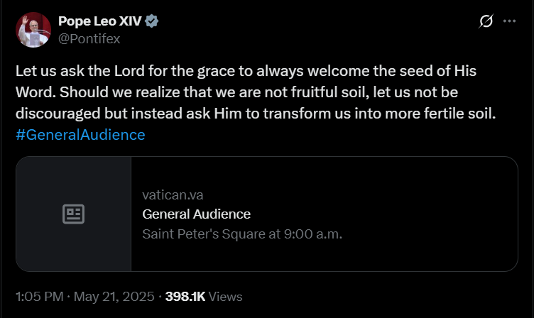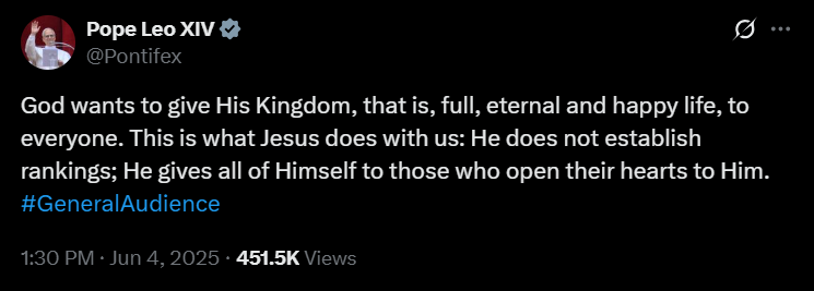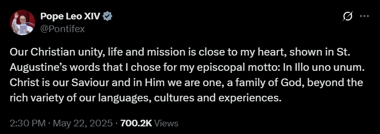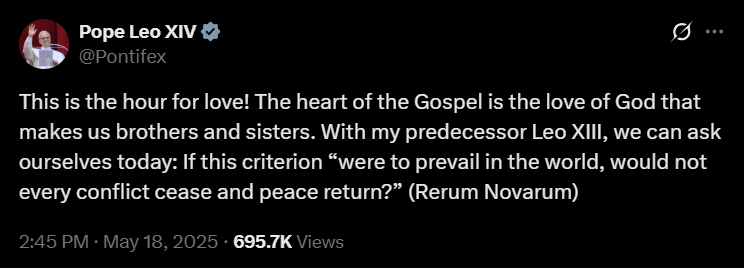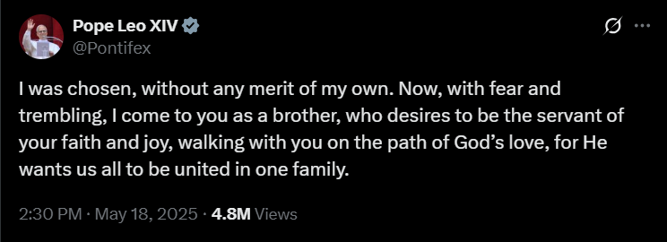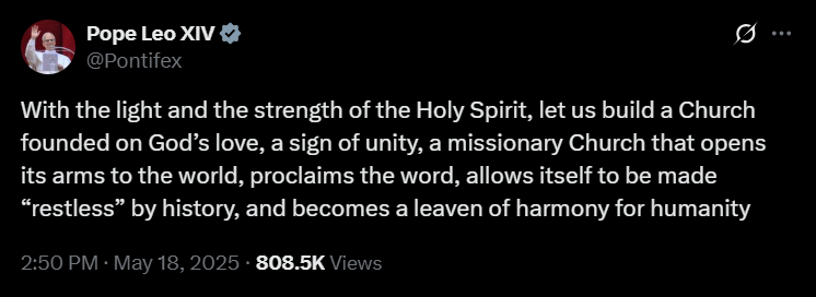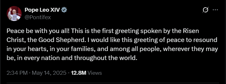 Leó pápa 2025 májusában indított X-fiókja a cikk publikálásának idejére már mintegy 18,8 millió követőt számlál. Szent Péter 267. utódja első bejegyzését május 14-én tette közzé. Ebben a megválasztását követően, a Szent Péter-bazilika loggiájáról elhangzott első szavait idézte – azt az üdvözletet, amellyel a több mint 100 ezres, a teret és a környező utcákat megtöltő ünneplő tömeghez fordult: