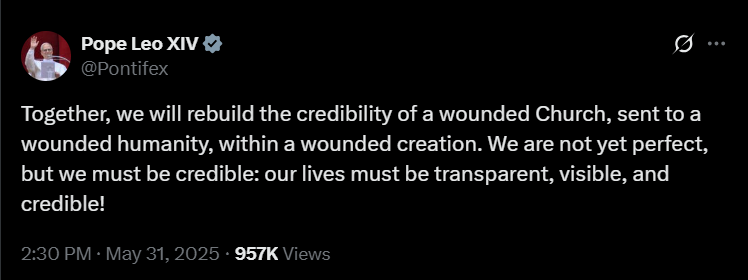 A pápasága alatt gyakran visszatérő motívumként XIV. Leó az Egyházat nem tökéletes intézményként, hanem sebzett közösségként látja, amelynek hitelessége éppen törékenységében rejlik. Május 31-i bejegyzésében hangsúlyozza: a világ sebein csak akkor tudunk gyógyítani, ha életünk átlátható, látható és hiteles tanúságtétellé válik.