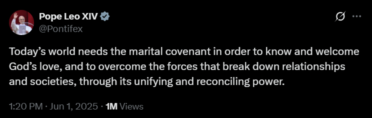 Június 1-jei posztjában a Szentatya a házasság szerepét emeli ki, mint Isten szeretetének befogadó és közvetítő szövetségét.