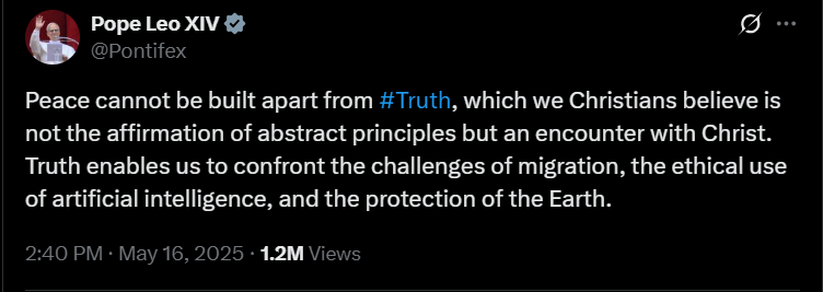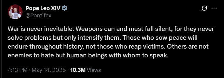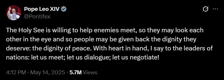 Május 14-én a Szentatya több bejegyzést is közzétett, amelyekben hangsúlyozta a béke sürgető szükségességét. Kifejezte a Szentszék készségét arra, hogy közvetítőként segítse azokat a tárgyalásokat, amelyek véget vethetnek a háborúknak. Posztjaiban Leó pápa a világ vezetőinek is üzent, határozottan felszólítva őket, hogy tegyenek lépéseket a konfliktusok befejezése érdekében, és válasszák a párbeszéd útját az erőszak helyett.